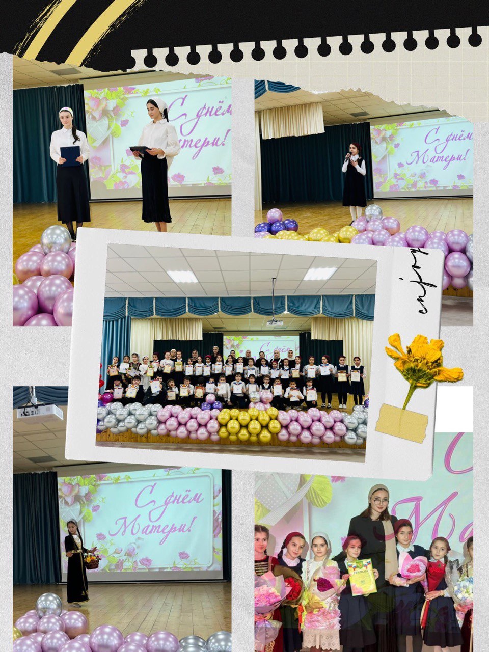 24.11.202324.11.2023г. в МБОУ «СОШ 4 с.п. Надтеречное им. С.М. Ахметханова» состоялось торжественное мероприятие, приуроченное Дню Матери, в котором приняли участие обучающиеся 1б, 2а, 2б, 3а, 3б, 3в, 3г, 4а, 4б, 5б и 7а классов.