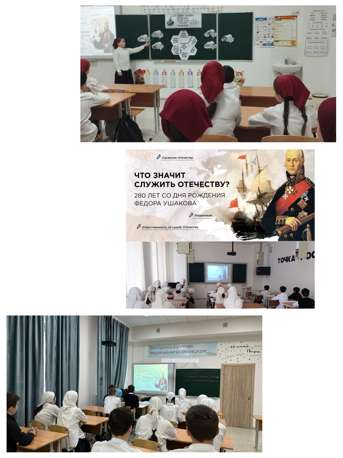 17.02.2025В МБОУ "СОШ №4 с. п. Надтеречное им. С. М. Ахметханова" 17.02.2024 проведён урок «Разговоры о важном» по теме «Что значит служить Отечеству? 280 лет со дня рождения Ф. Ушакова»